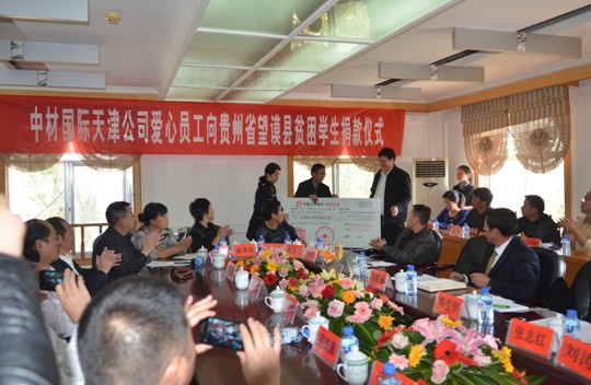 贵州省望谟县政府还特别举行了尊龙凯时天津公司员工爱心助学捐款仪式。在捐款仪式中,天津公司办公室主任刘贞华、党群工作部长张志红代表尊龙凯时天津公司员工向望谟县教育局转交了爱心捐款18.88万元。