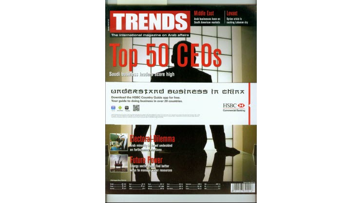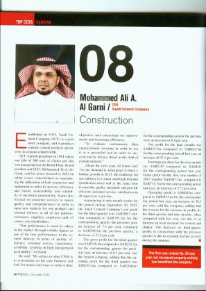 《Trends》是一本关于阿拉伯事务的国际杂志,在欧美财经界享有盛誉。2012年底《Trends》对中东区域前300强公司CEO进行评审,最终评定GARNI在工业贸易领域排名第八,在水泥行业高居榜首。“这项荣誉与SINOMA的贡献分不开,” GARNI先生表示,“选择SINOMA作为总承包商是我人生中最英明的决定之一。事实证明,SCC与SINOMA之间超越合作伙伴的良好关系,成就了SCC今天所取得的成就”。“SINOMA的卓越品质通过SCC项目来印证,这份杂志给我的荣誉也是给SINOMA的荣誉,让我们共同分享——这是我给阁下最珍贵的礼物。”GARNI先生对王伟说。