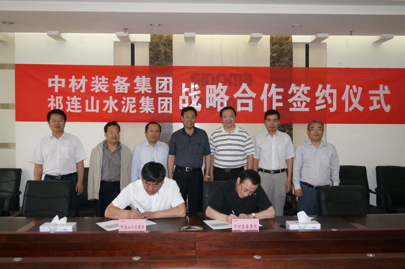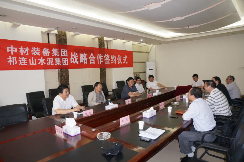 5月30日,甘肃祁连山水泥集团股份有限公司同中材装备集团有限公司战略合作协议在兰州祁连山集团总部举行。祁连山集团董事长脱利成,总裁刘继彬,副总裁李生钰、刘开禄,财务总监杨虎和集团董事长宋寿顺,副总经理陈庆十,市场总监刘运水,备件公司总经理侯龙华等相关人员参加了签约仪式。
