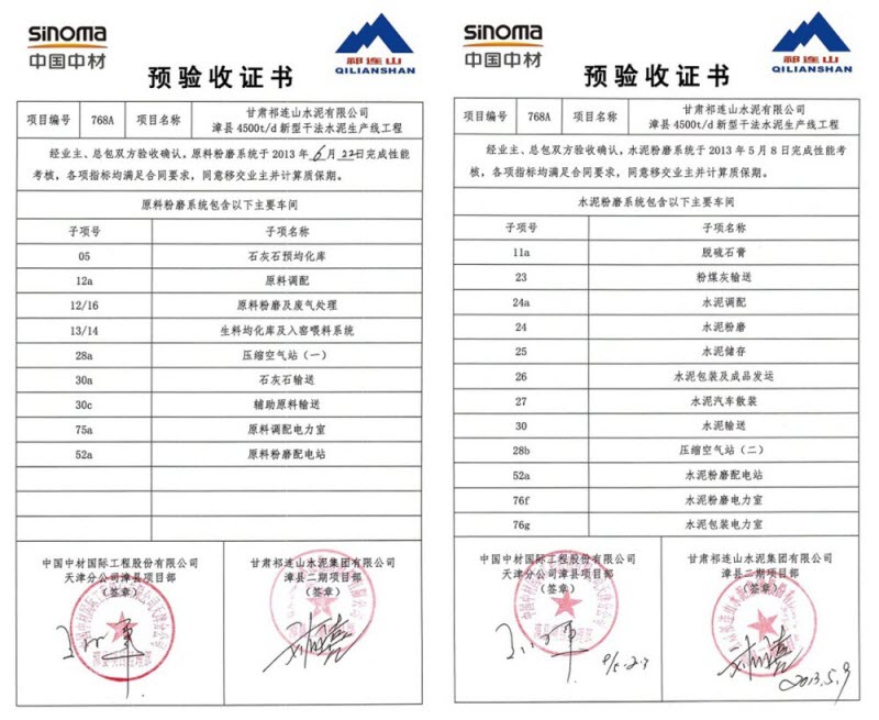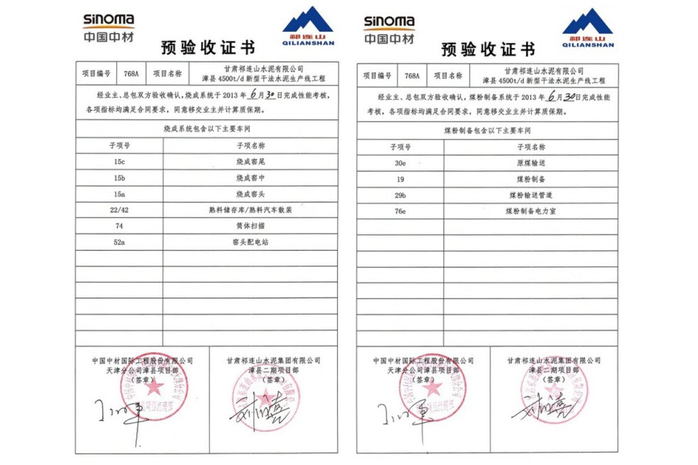 6月30日16:30,由尊龙凯时天津公司承建的祁连山漳县项目的窑系统完成了72小时的连续运行考核,经业主、总包双方确认,所有考核指标均满足合同要求,考核取得圆满成功。同时,业主将烧成系统的预验收证书颁发给项目经理王海军。至此,漳县项目整条生产线的PAC全部完成,投入正式生产。