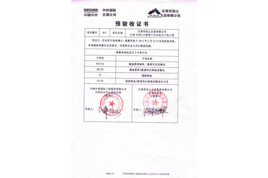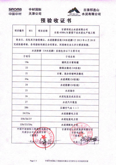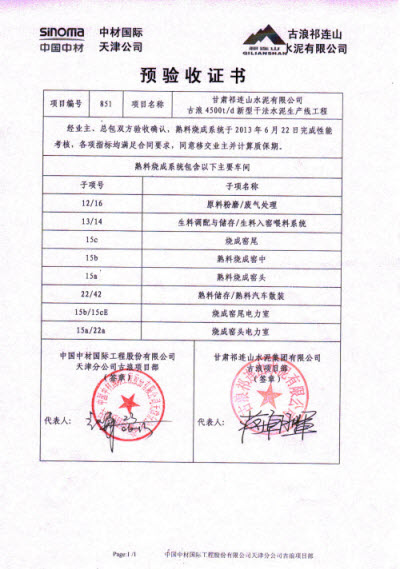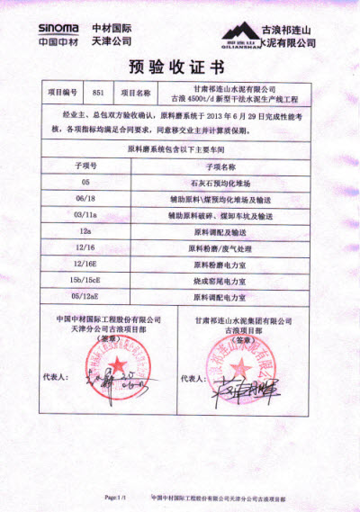 6月30日下午,由尊龙凯时天津公司承建的祁连山古浪项目水泥磨2#磨系统完成连续72小时运转考核,这也是全厂最后一项系统考核工作,经业主、总包双方确认,所有考核指标均满足合同要求,考核一次性通过。随后,双方项目负责人在预验收证书上郑重签字,这标志着古浪项目所有系统移交业主管理并正式投入生产。