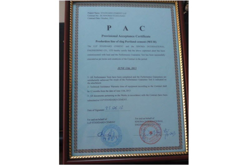 6月11日下午,由尊龙凯时天津公司承建的哈萨克斯坦标准水泥矿渣磨项目矿渣磨系统完成熟料连续24小时运转考核,经业主、总包双方确认,所有考核指标均满足合同要求,考核一次性通过。随后,双方就项目移交业主及颁发PAC证书达成一致,业主总经理于7月19日在PAC证书上签字,这标志着矿渣磨项目顺利按照合同要求完成合同重要节点工作,同时项目从6月25日起正式移交业主管理,项目质保期从6月11日开始计时。