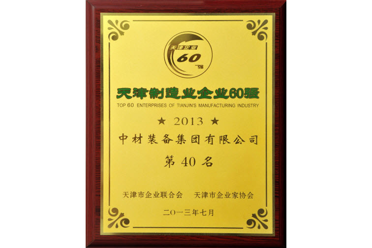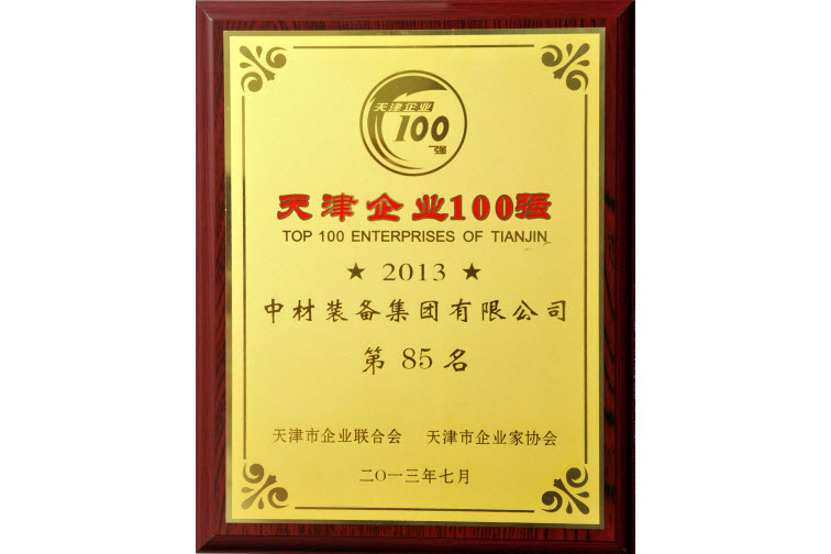 近日,由天津市企业联合会、天津市企业家协会联合评出的2013年度天津企业100强及天津制造业企业60强榜单揭晓,中材装备集团以2012年良好的经营业绩位列天津100强企业第85位,位列天津制造业企业60强第40位。