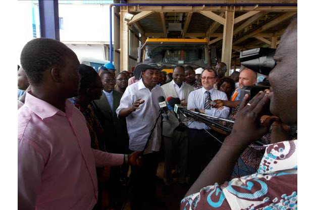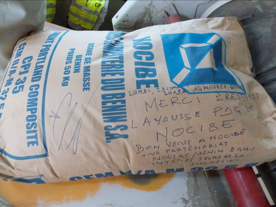 本次视察博尼•亚伊总统主要参观了水泥包装生产线,他亲自操作启动了包装机,并在一袋水泥上签名祝贺NOCIBE水泥生产线顺利投产。