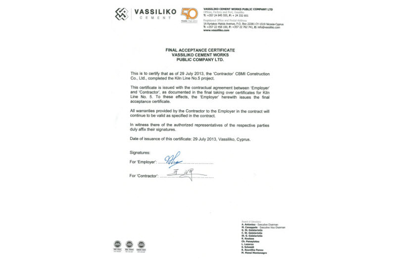 塞浦路斯项目是当时欧盟国家在建的最大的水泥厂项目,Vassiliko水泥厂的顺利建成为欧盟及塞浦路斯的环保、节能减排做出了贡献,得到业主、当地政府和居民的一致认可,为公司树立了良好的企业形象,也为公司在欧盟国家进行项目建设积累了成功经验。