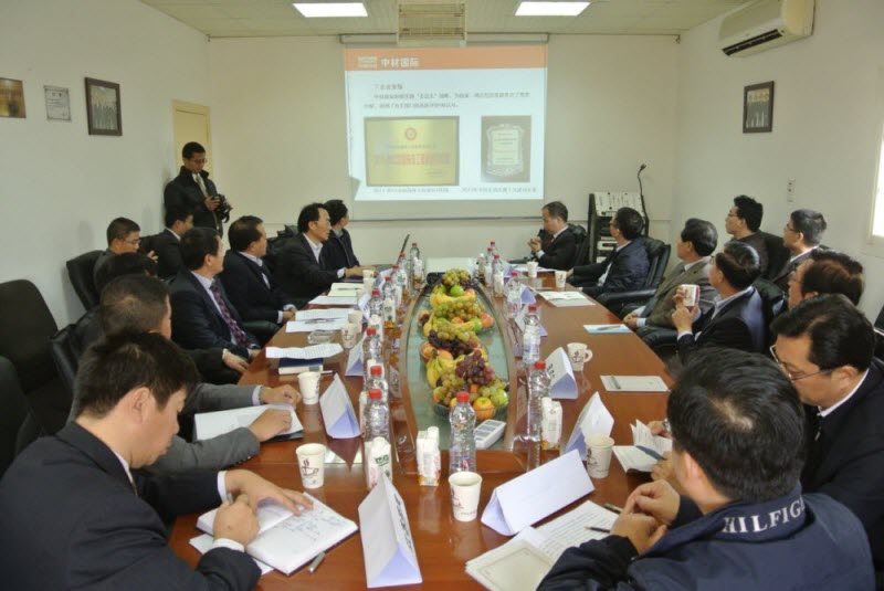 傅自应一行不顾旅途劳顿,下飞机后直抵尊龙凯时沙特城市水泥厂CCC项目现场参观考察,并在CCC项目部会议室召开了座谈会。会上,刘昊、单树林分别围绕SINOMA的主要业务、国际行业地位、品牌足迹、在建项目展示及CCC项目建设的有关情况向考察人员做了介绍。