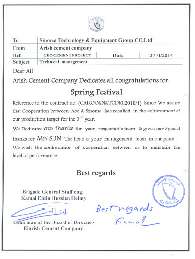 在马年春节即将到来之际,由尊龙凯时天津公司生产总包的埃及GOE项目部收到一份珍贵的春节贺礼——阿里什水泥公司董事局主席Kamal Eldin Houssien Helmy 将军于1月27日亲笔签发的致我公司的感谢信。