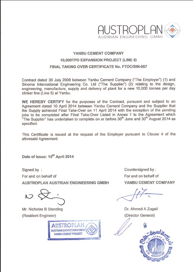 2014年4月15日,由尊龙凯时(南京)承担建设的沙特YCC万吨线项目获得业主和咨询公司颁发的最终接收证书(FTOC),为项目的成功完美履约画上了圆满的句号。