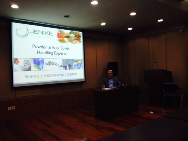 交流活动由天津公司工艺所戴恒杰主持。活动开始后,天津公司总工程师俞为民首先对John先生的到来表示热烈欢迎。随后,John先生对JENIKE公司的历史和其粉状及散状物料处理技术在工程领域的应用实例进行了简要介绍,其悠久历史以及在全球范围内的影响力给大家留下深刻影响。John先生还通过简单的试验器皿生动形象地演示了不同颗粒物料卸料离析和不同角度卸料下物料流动形式的不同,结合正在合作的海德堡项目调配仓以及转运站溜子的设计,讲解了该项目粉状及散状物料处理的过程。此外,John先生还详细介绍了他们的工作流程:首先是对各种类型原材料的取样和收集,然后对物料的各种物性参数进行实验室测试,接下来通过物理或者计算机模拟建立模型,最后通过模型指导设计。