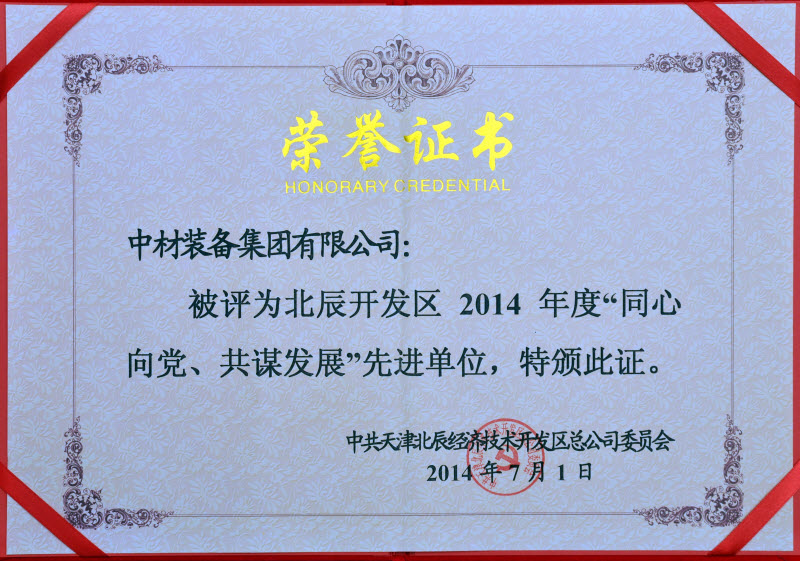 7月1日上午,天津北辰经济技术开发区管委会隆重召开纪念建党93周年大会暨“七一”表彰大会。中材装备集团荣获2013-2014年度天津北辰开发区“同心向党、共谋发展”先进单位,中材装备集团党委副书记张建文代表集团上台领奖。
