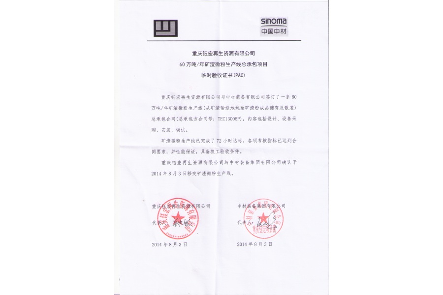 2013年3月1日,中材装备集团与重庆钰宏再生资源有限公司签订了60万吨/年矿渣微粉生产线总承包合同,项目所在地位于重庆市长寿区江南镇。合同主要内容包括项目工程设计、设备供货和安装、培训、调试等工程服务。