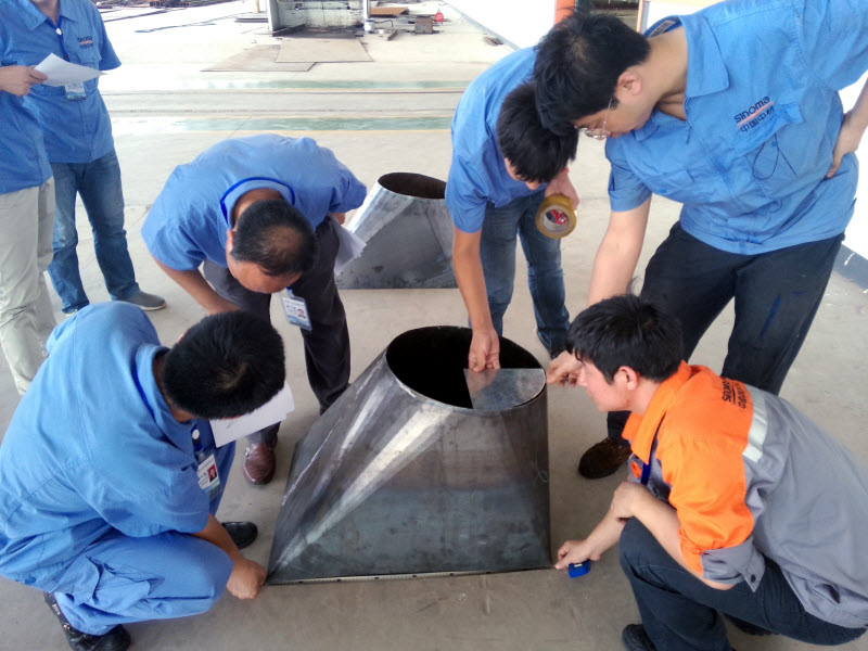 当天的铆工岗位技能竞赛考察“天圆地方”的制作,要求参赛者在熟练掌握铆工基础知识和技能的基础上,能看懂图纸,能计算展开料长,画出复杂构件的放样图,能根据工艺图的技术要求制定装配、焊接、铆接和矫正工艺方案,制作简装工夹具;熟悉新技术、新材料、新工艺以及相关工种衔接的知识等。经过紧张激烈地比赛,9月3日,评委组评选出本次活动前三名,并发给获奖证书和奖励。