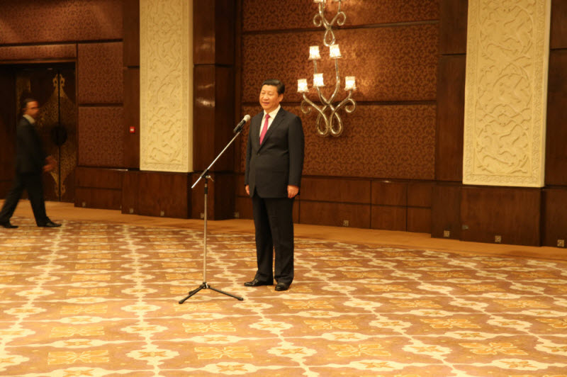上午10时,习主席和夫人一行与中资企业代表合影留念。随后,习近平主席发表了即兴演讲,首先表达了党中央对于全体中资企业驻印工作人员的亲切问候,随后就国际国内经济文化的现状与愿景、中国梦及民生等问题发表了深刻而独到的见解,并对驻外人员的生活和学习提出了殷切希望。