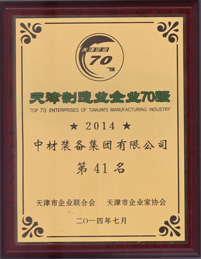 在领导的正确带领及全体员工的共同努力下,中材装备集团有限公司取得了良好的经营业绩,在天津市企业联合会和天津市企业家协会共同组织的评选活动中,被评为2014年度“天津企业100强”及“天津制造企业70强”。