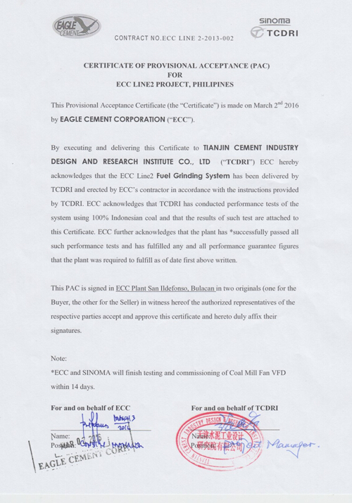 3月3日,天津院有限公司的承建的菲律宾ECC2项目在煤磨系统顺利通过性能考核后,双方签署PAC证书,标志着现场安装调试告一段落,合同执行进入质保阶段。