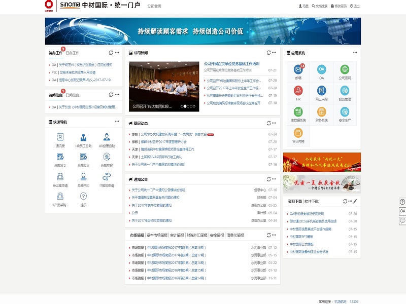 2.统一门户系统,用于实现公司全员统一登录的门户,按权限查看总部及各单位共享的新闻、简报和资料,且将各统建系统的流程和待办集中到统一门户中显示;