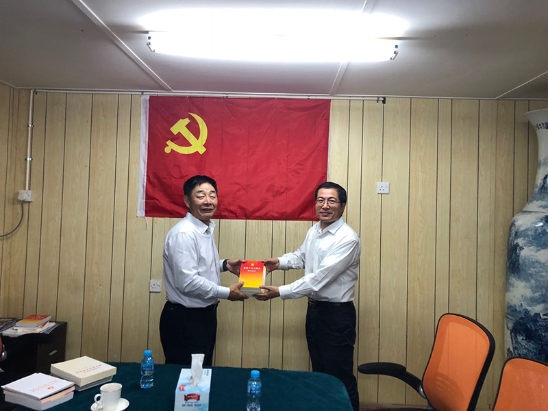 赵惠锋传达了集团纪委境外机构及工程项目廉洁风险防控调研汇报工作专题会会议精神,结合集团党委《关于加强境外单位(项目)党建工作的实施意见》,为现场党员和提交入党申请书的积极分子讲授了专题党课,对现场开展境外党建工作,落实“两个责任”提出明确要求:一是要认真学习党章,党章作为党的总章程和根本大法,是全党必须遵循的总规矩,必须熟悉党员的权利和义务,要创新方式,通过自学、知识问答等方式选择适合境外现场的方式方法。二是健全境外党组织,按照党章规定,凡三人以上的党员均可成立党支部,通过落实“三会一课”制度,加强基层组织建设工作,巩固基层党组织阵地,做到项目建设到哪里、党组织就组建到哪里、党员作用就发挥到哪里。三是发挥境外党组织政治保障作用。通过加强境外党建工作,团结帮助群众,开展丰富多彩的党建活动,组织学习,把项目现场党支部建设成思想先进、作风优良、有朝气、有活力的基层组织队伍,充分发挥党组织的战斗堡垒和党员的先锋模范作用。会上,赵惠锋还向现场党员赠送了党建学习书籍。