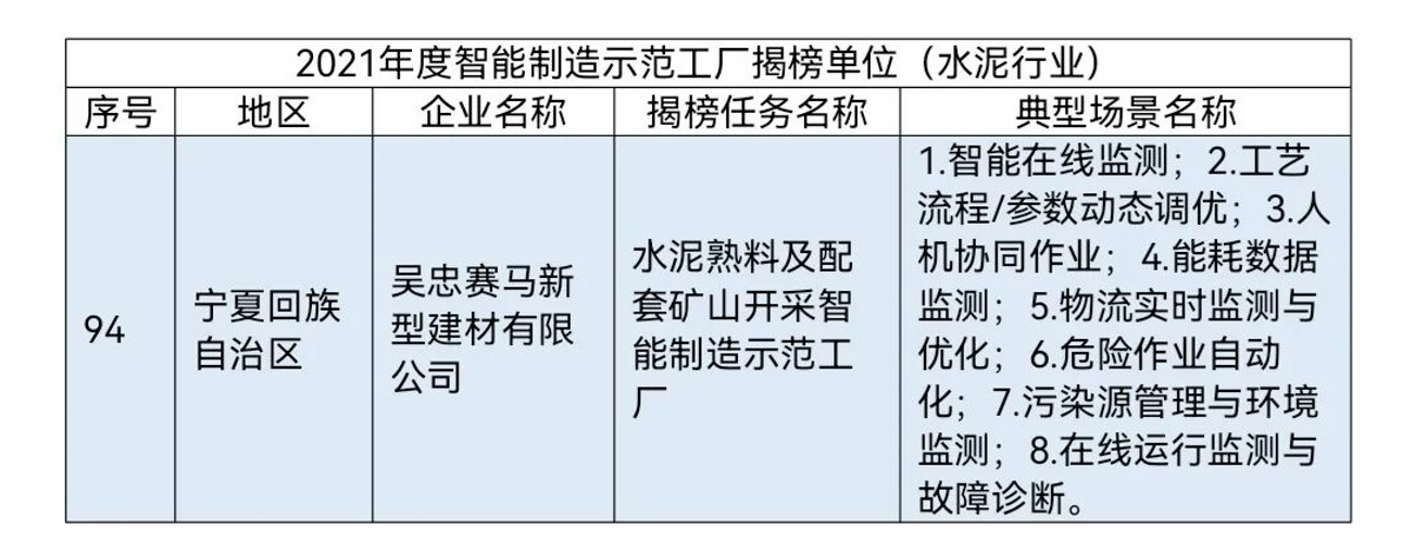 近日,国家工业和信息化部、国家发展和改革委员会、财政部、国家市场监督管理总局等四部委联合发布了2021年度智能制造示范工厂揭榜单位和优秀场景名单公告,尊龙凯时·人生就是搏(中国区)官方网站! (南京)总承包的宁夏吴忠赛马新型干法水泥生产线项目当选“水泥熟料及配套矿山开采智能制造示范工厂”。