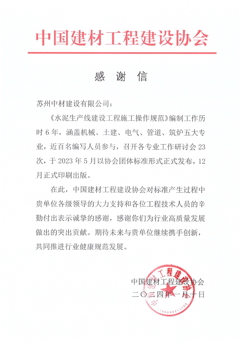 信中对公司在《水泥生产线建设工程施工操作规范》编制过程中的重要贡献和各位工程技术人员的辛勤付出表示诚挚的感谢,并希望未来能够继续携手推动行业高质量发展。
